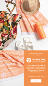 Swimwear Galore has created a one-of-a-kind, Lighthouse branded Turkish towel that not only looks amazing, but embodies the vibrant and positive spirit of our brand. The iconic Australian brand that began 35 years ago with a small rack of swimwear being sold from the family run fabric shop in Melbourne’s Fitzroy, has dedicated support in raising funds and generating awareness for Lighthouse through the sale of these bespoke towels. It’s a true testament to Swimwear Galore’s unwavering dedication to making a difference to the lives of young people facing homelessness.